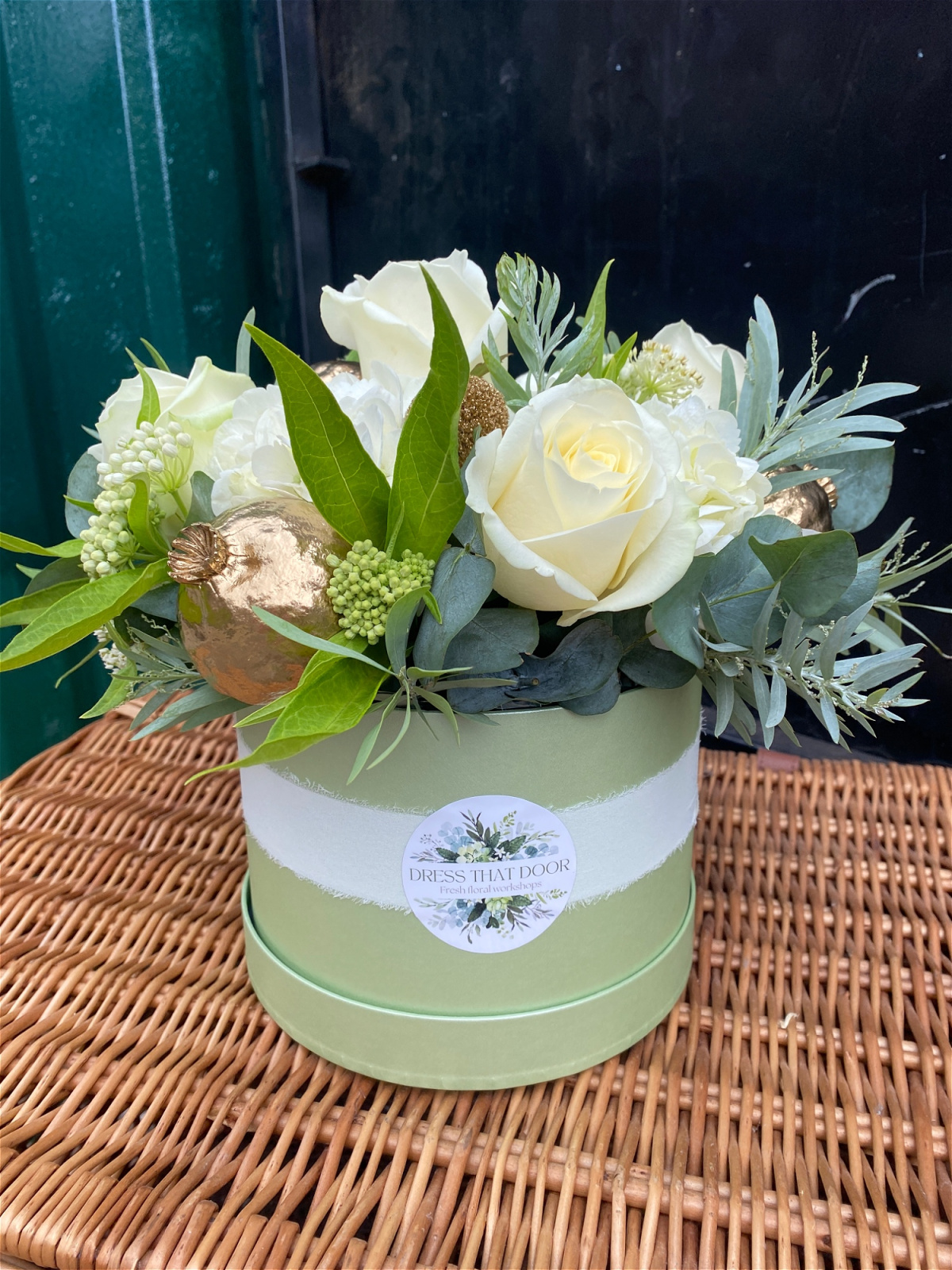 A elegant box arrangement that is timeless and classic. Delicate creams, crisp whites and soothing golds encompass this piece that sends a message of love and fondness to the recipient.