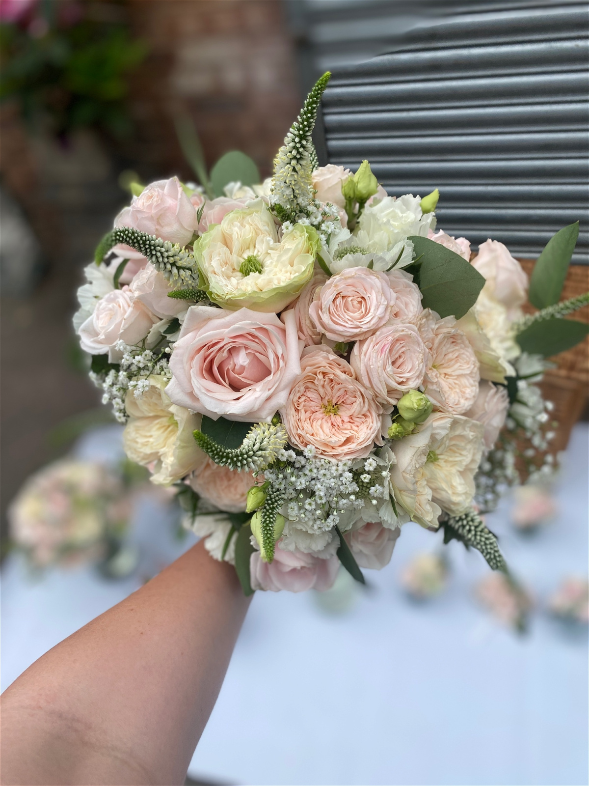 A delicate hand tied that is really jam packed tight with pale pinks, gentle whites and subtle greens. A completely dreamy bouquet that will tick every Romantic’s box.